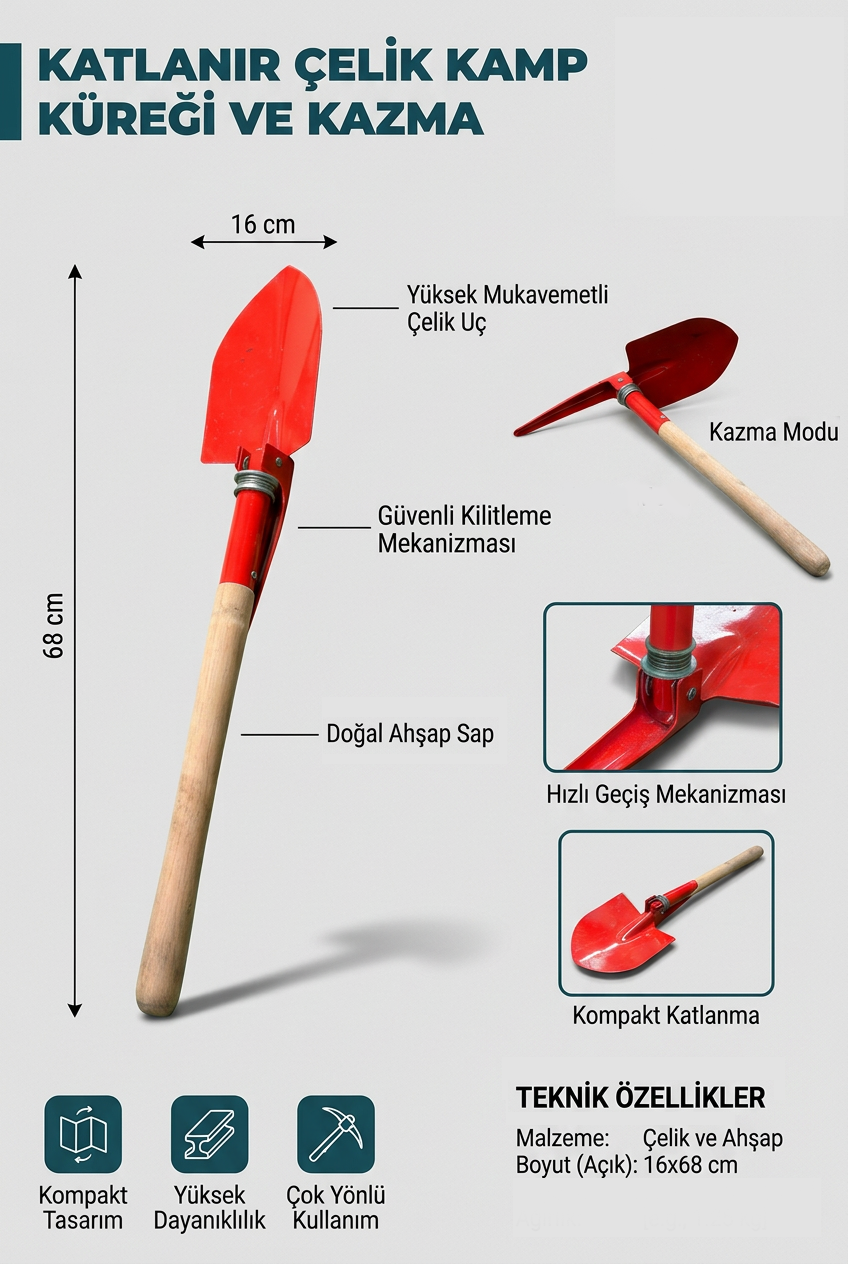 - Ürün Tipi: Katlanabilir kamp küreği ve kazma