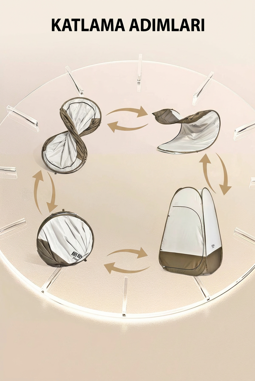 Katlanır kamp duş çadırı; duş, giyinme ve WC kabini olarak kullanılabilir. Rüzgara dayanıklı, gizlilik sağlayan, hızlı kurulumlu tasarım.
