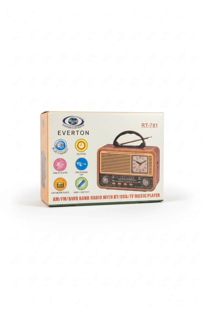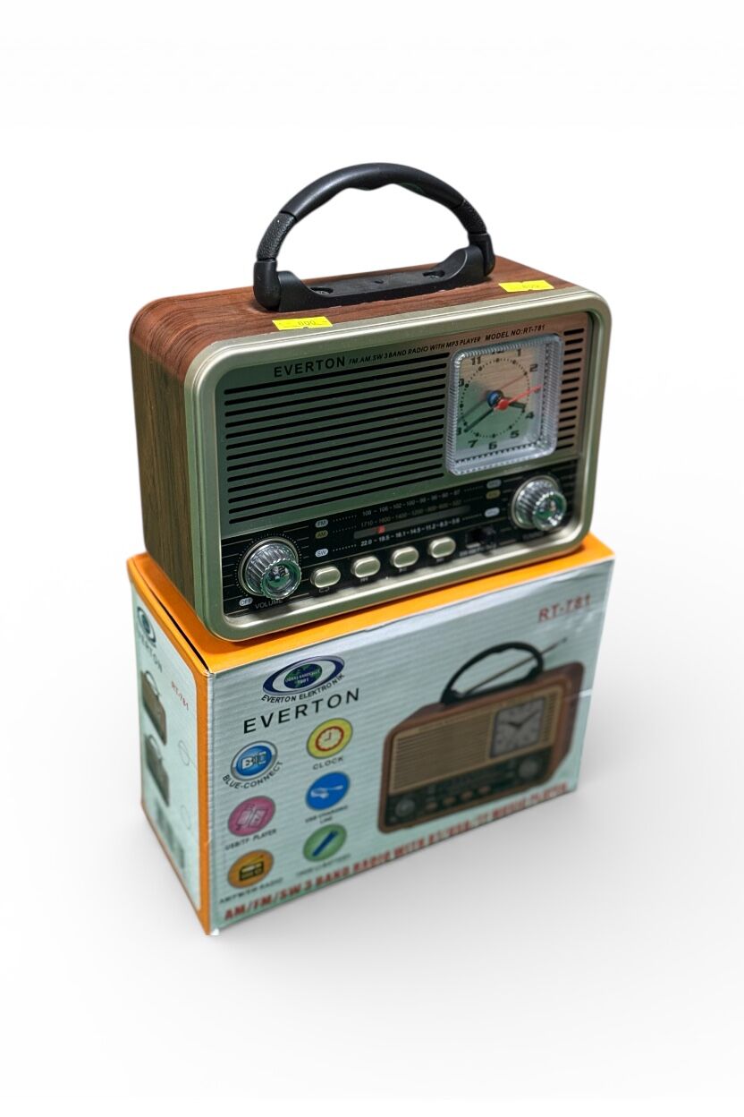 Retro görünümü, analog saati ve çok yönlü kullanım özellikleriyle Everton RT-781 nostaljik radyo, hem dekoratif bir obje hem de pratik bir müzik çalar olarak ev, kamp, piknik, mutfak, balkon ve bahçede keyifli bir kullanım sunar.