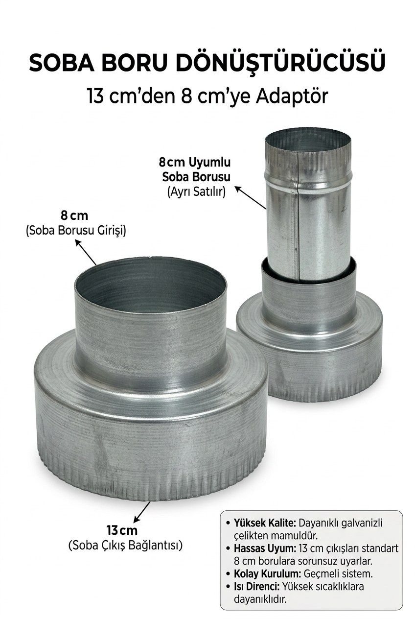13 cm çıkışa sahip soba veya çadır sobalarınızı, 8 cm boru sistemleriyle sorunsuz şekilde kullanmanızı sağlayan bu dönüştürücü adaptör, pratik ve güvenli bir bağlantı sunar.