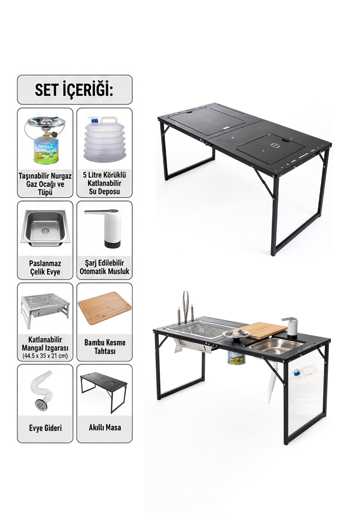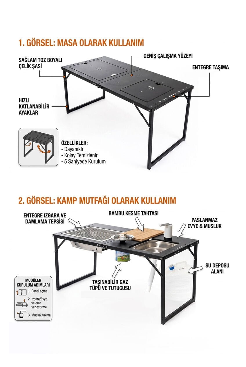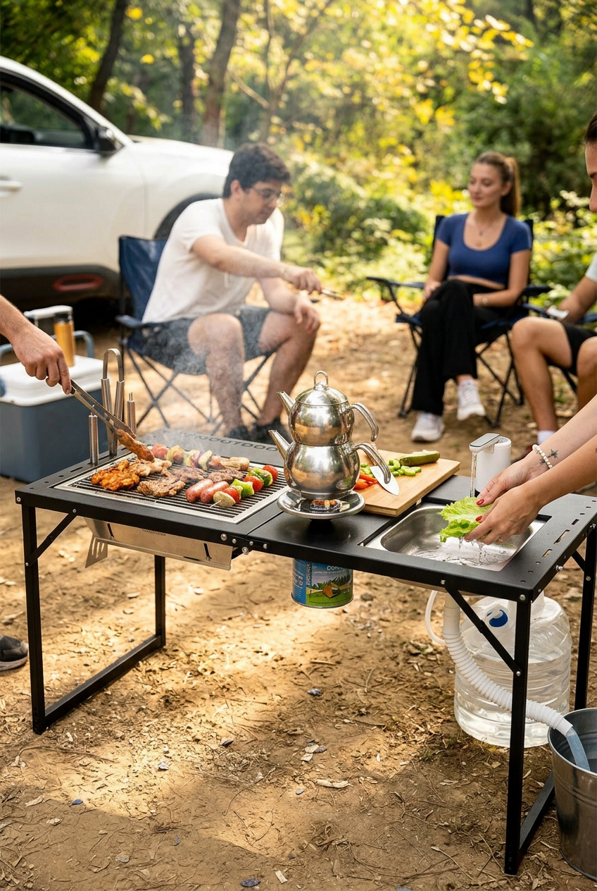 - Entegre kamp mutfağı sistemi (mangal + ocak + evye)