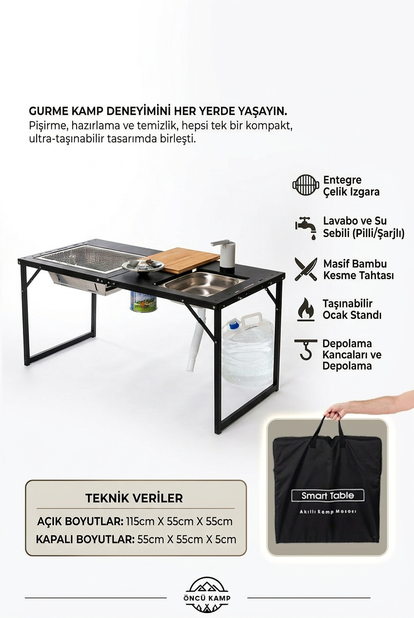 Katlanabilir yapısı sayesinde taşıması kolaydır. Açıldığında ise tam bir outdoor mutfak istasyonu haline gelir.